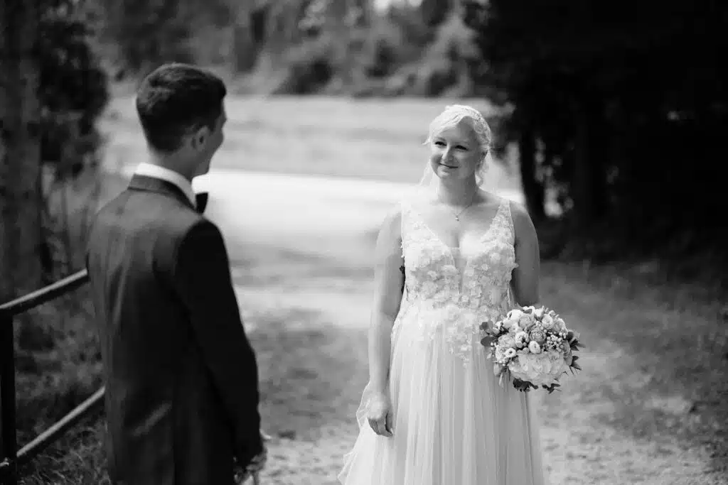 Der Tag begann trocken und versprach beste Voraussetzungen. Noch vor der freien Trauung nutzten wir die Zeit für das Brautpaarshooting mit einem emotionalen First Look. Die beiden begegneten sich voller Vorfreude und strahlten dabei um die Wette – ein Moment, der für immer in Erinnerung bleiben wird.